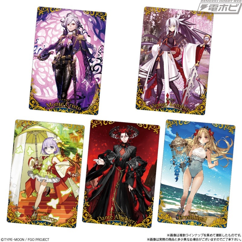 The lineup includes Avenger / Edmond Dantès (Count of Monte Cristo), Ruler / Kenshin Uesugi, Alter Ego / Kazuradrop, Pretender / Dante Alighieri, and Beast / Ereshkigal. Each card boasts a shimmering metallic finish, while the highest rarity cards use a special “Holonis” printing technique that gives the character a three-dimensional appearance.