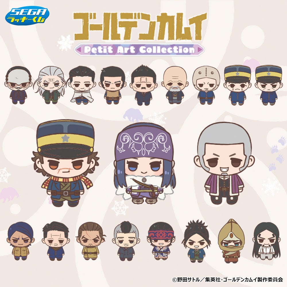 Sega releases the Sega Lucky Lottery TV Anime “Golden Kamuy” Petit Art Collection on March 29, 2024. This collaboration with the popular manga by Satoru Noda offers character goods featuring chibi versions of Sugimoto, Asirpa, and more. Additionally, a “Last Lucky Prize” includes a plush set of young Tsurumi and Hijikata.